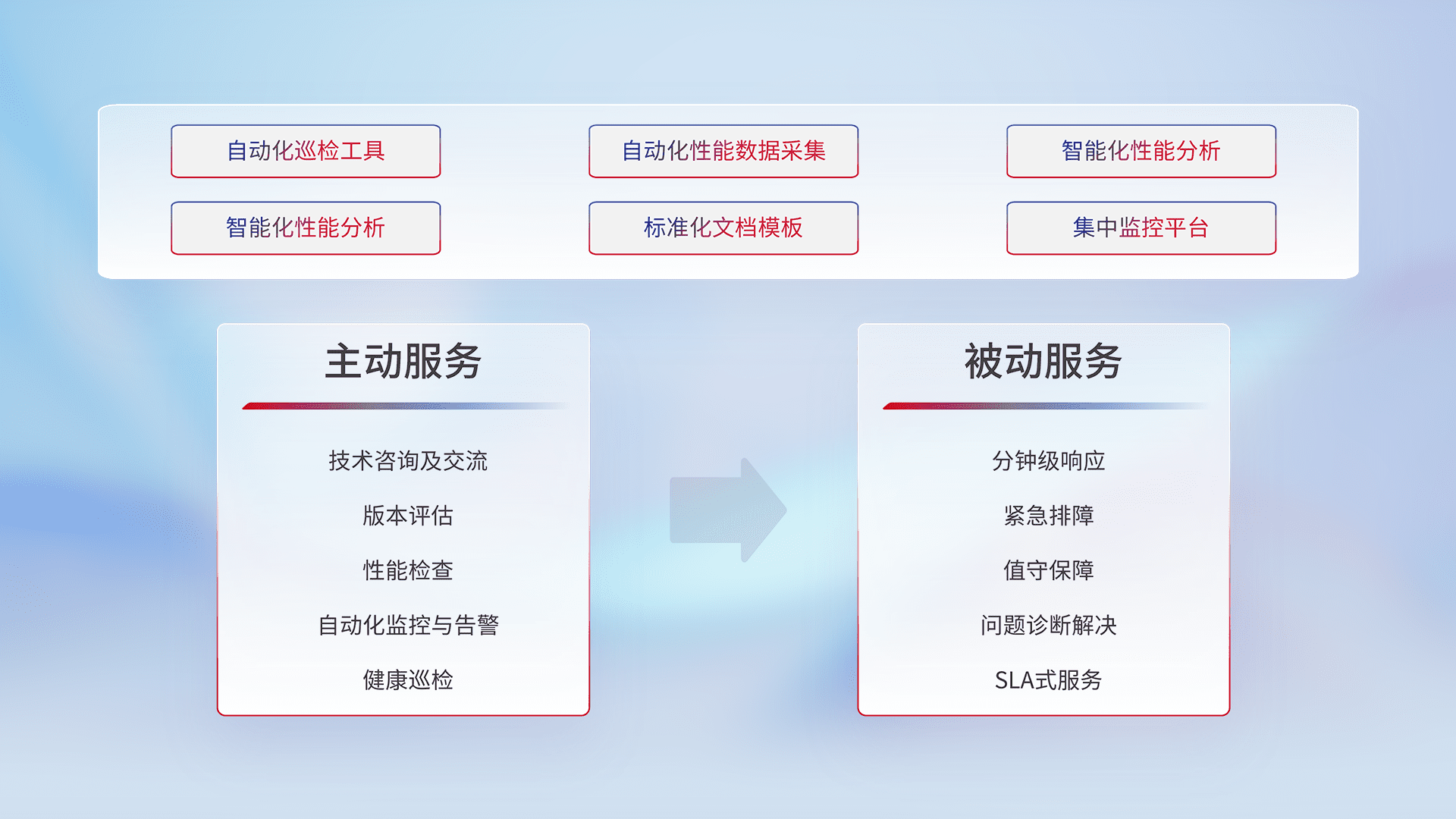 智能化工具和标准化文档,,保障服务质量,,提供主动服务(包含技术咨询、、、、版本评估、、、、性能检查、、自动化监控与告警、、、、健康巡检)和被动服务包含(分钟级响应、、、、紧急排障、、、、值守保障、、、、问题诊断解决、、、、SLA服务)。。。。