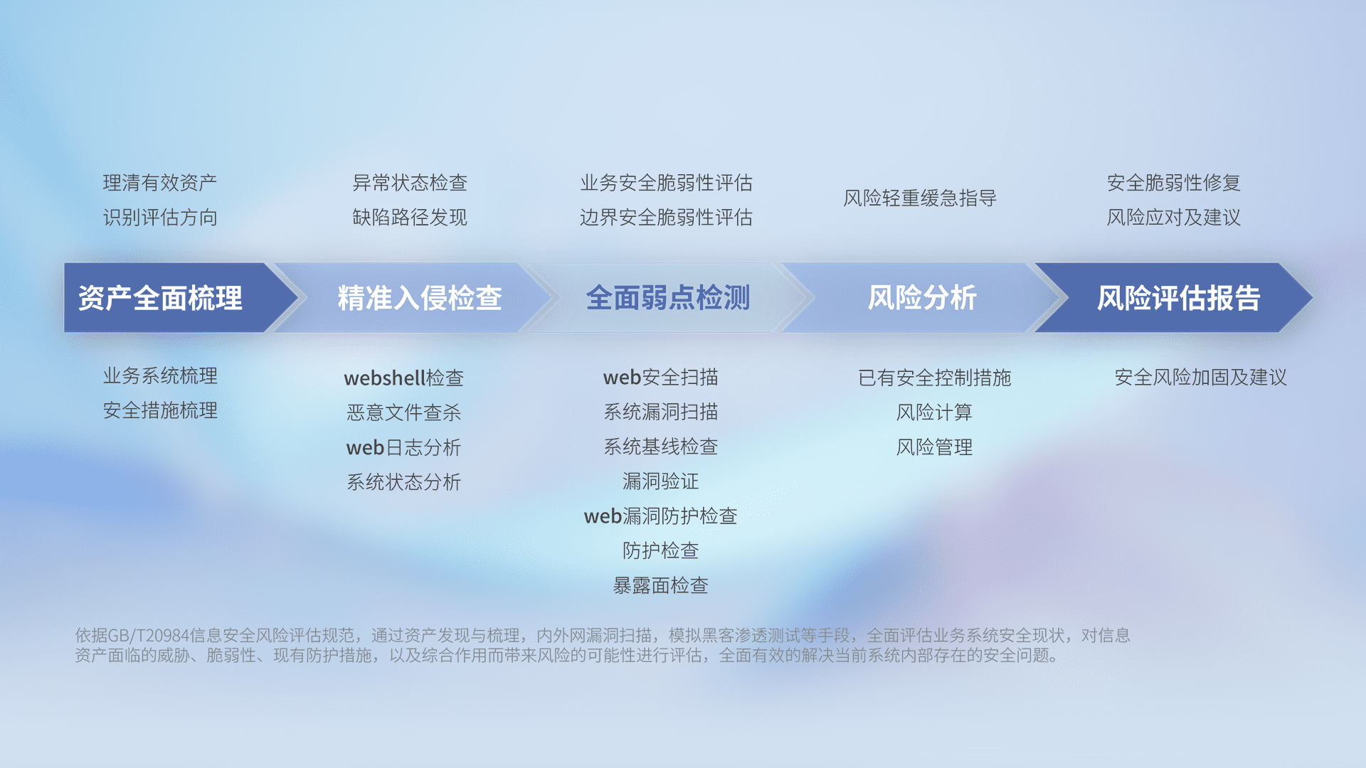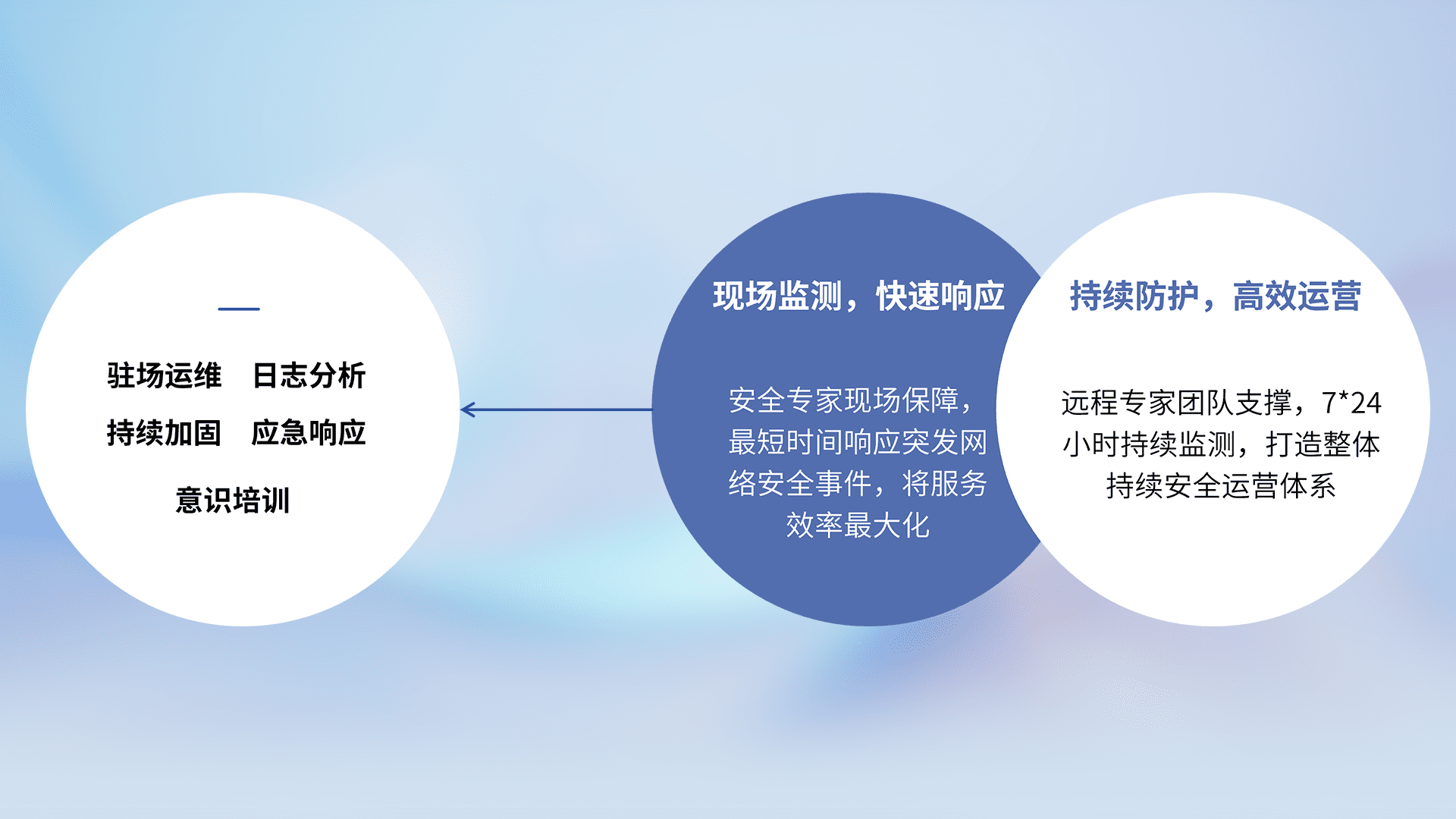 针对客户行业特性,,,以专业的安全服务+多厂商联合解决方案提供专属的一站式安全管理服务,,帮助客户全面感知网络空间威胁,,,基于识别、、、检测、、、、分析、、、防护、、监测、、响应的服务理论模型,,,从方案咨询、、、集成交付、、、评估验证、、、优化加固、、、运维运营,,,致力于为客户提供完整的闭环管理式安全服务。。以实战经验为客户打造高抵御风险的安全体系,,,,帮助客户发现威胁、、、对抗威胁、、、处置威胁,,,不断积累安全对抗能力,,持续保障数字化安全。。。。